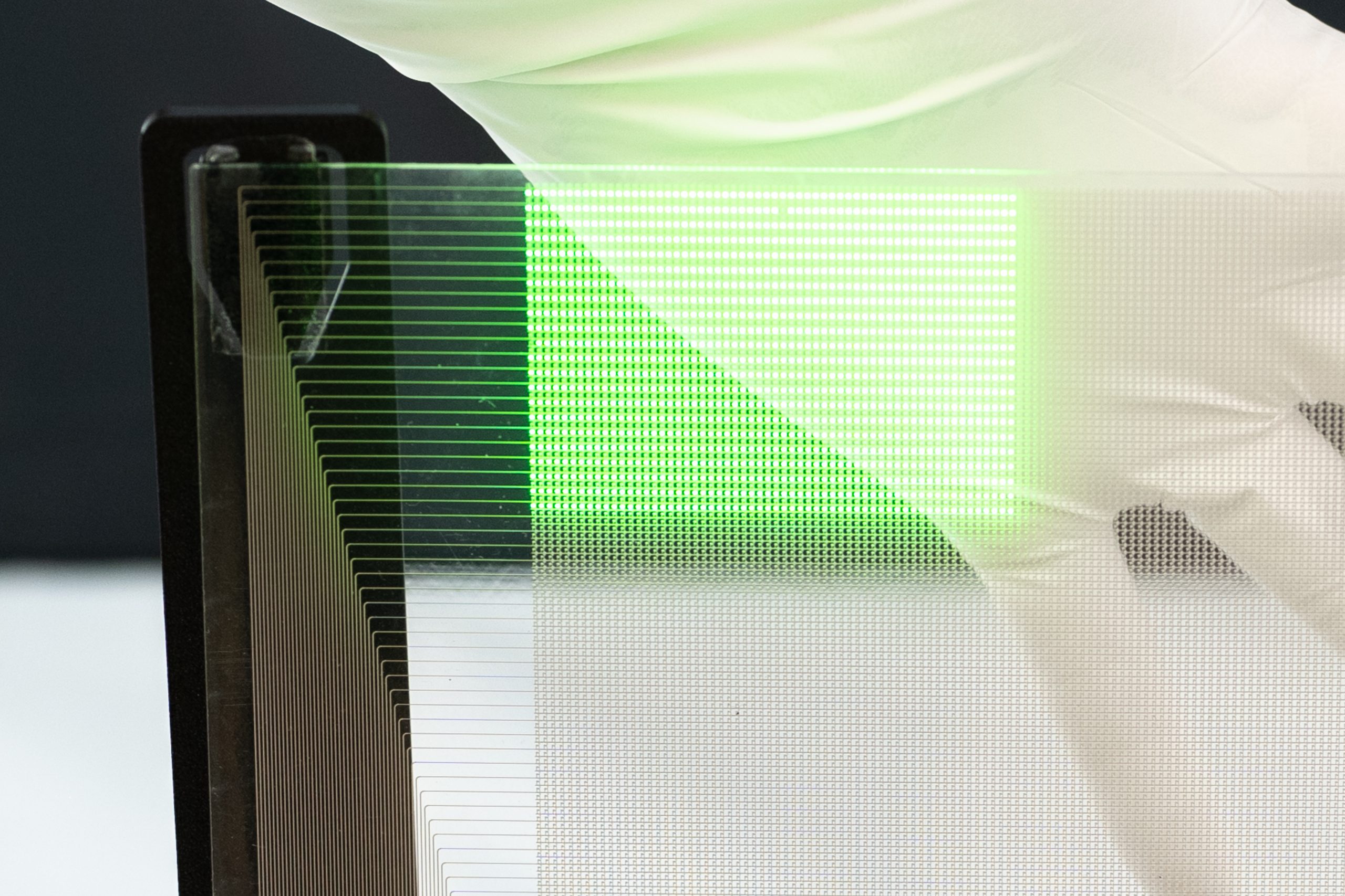 This level of complexity (100‘s of printed signal lines that are 40 µm wide, 100‘s of printed power lines that are 150 µm wide, separated by a 2-layered dielectric print) has seldom been demonstrated in printed electronics. On top of this, >25k miniLEDs of 200 µm x 100 µm have been assembled, making this one of the most complex hybrid printed electronics prototypes ever shown to function properly. The entire stack is <0.5 mm thick, which makes this prototype suitable for glass integration.